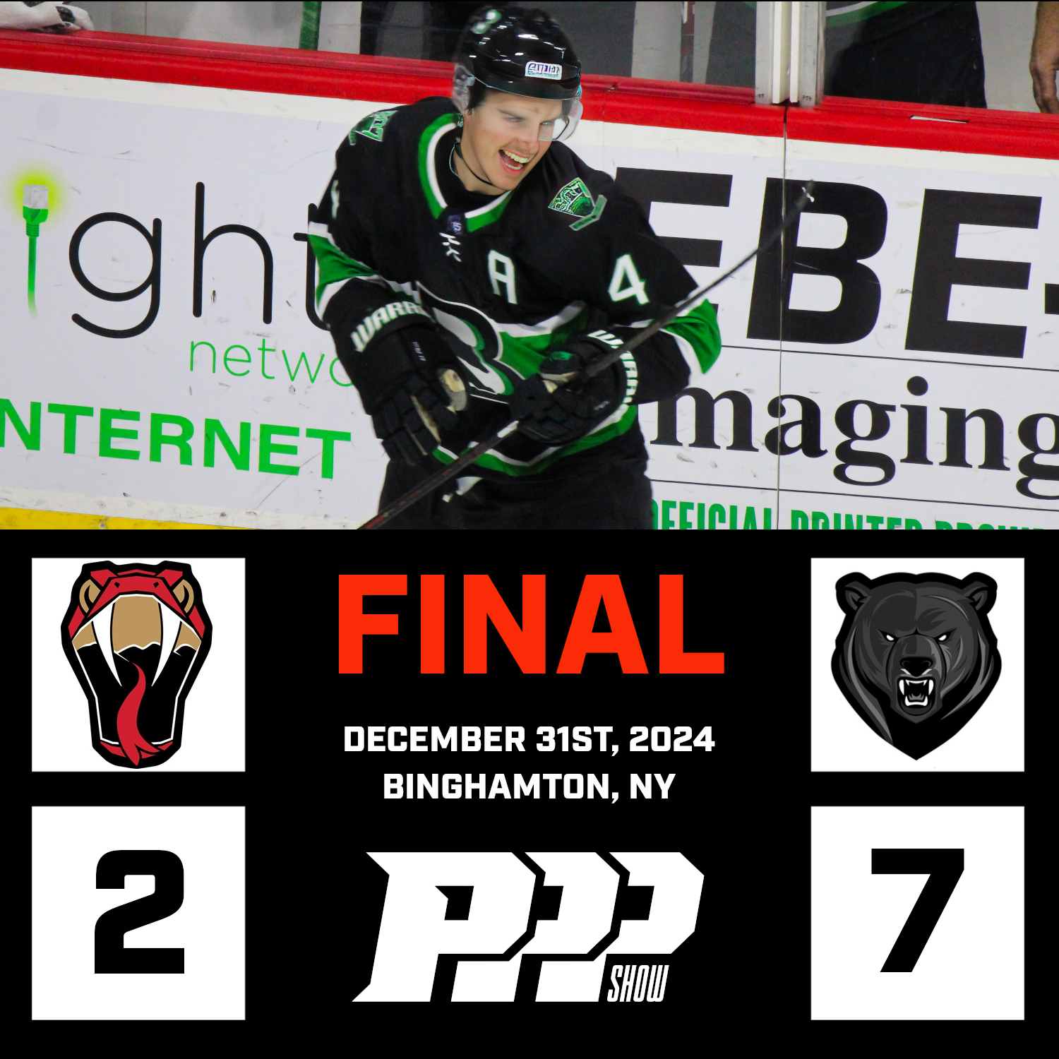 | The Binghamton Black Bears (20-3-1) defeated the Hockey Club Venom (6-10-0) in front of a sell out crowd in Binghamton on New Years Eve by the score of 7-2. The Black Bears get on the score board first with a tally from Gavin Yates who got an unassisted goal just 4:51 into the game. The Captain Tyson Kirkby then scored the games second goal of the game, also unassisted at the 12:56 mark making this a 2-0 game. However the story of the night happened 5:55 into the second period as Tyson Kirkby and Cameron Cervone were in the penalty box for the Black Bears and Dakota Bohn scored his first goal of the season, a 5 on 3 short-handed goal, his second 5 on 3 short-handed goal of his career. Not to be out done, Tyson Kirkby scored his second goal of the game, also short-handed 15 seconds into the final period. Dakota Bohn then scored a power play goal, scoring his 2nd goal of the game at the 8:16 mark making this a 5-0 lead for the Black Bears. The Venom then got on the score sheet with a goal ten seconds after the Bohn power play goal making this a 5-1 game off the stick of Dzianis Zaichyk. The Venom scored their second goal of the game off the stick of Danila Belov just 2:37 later pulling the score to a 5-2. However with Mark Pozsar in the box for tripping, the Don Father, Donald Oliveri scored the Black Bears second power play goal of the game with 5:56 left to go in the game. Finishing the scoring in the game, Khaden Henry scored the Black Bears 7th goal with 4:37 left to go in the game securing a 7-2 win for the Black Bears, their 7th win in a row and 20th of the season. |