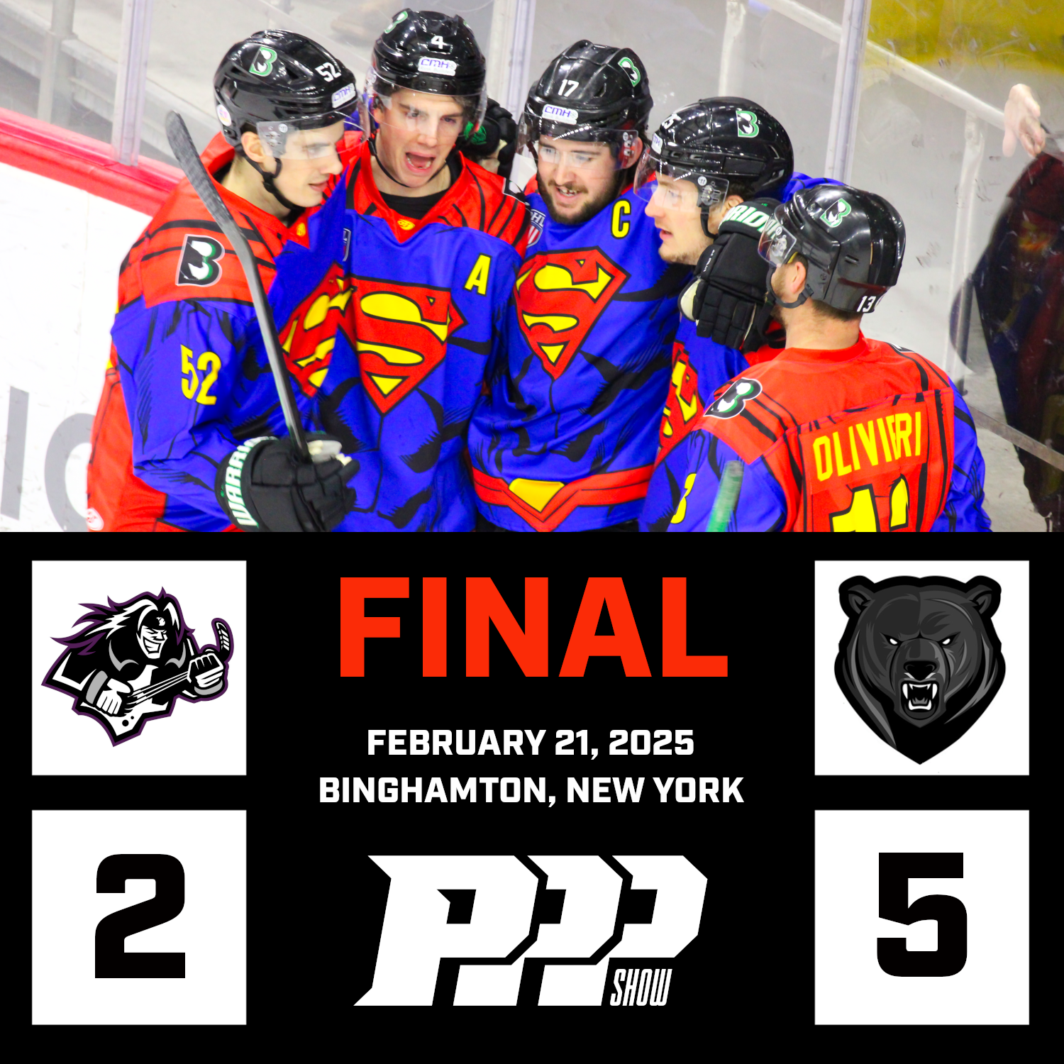 | The Binghamton Black Bears (35-4-1) defeated the Motor City Rockers (13-23-2) on Friday night in BInghamton by the score of 5-2. The Black Bears got on the score sheet first after a tip in goal from Chris Mott 9:14 into the opening period. Just 3:41 into the middle period, Dan Stone buries the Black Bears second goal of the game while shooting from the high slot giving the home team a 2-0 lead. Austin Thompson made this a 3-0 game with the third attempt in a sequence of shots on Trevor Babin and the third shot got past the Rockers net-minder. The Black Bears scored their 3rd goal in the period, this time on the power play as the Captain Tyson Kirkby scored from a high risk area to the side of Babin. The 3rd period did not start as the Black Bears would have hoped with Eli Rivers scoring an unassisted goal just 19 seconds into the final period. The Black Bears get their 4 goal lead back with a goal from Gavin Yates who scored at the 4:50 mark of the third period. The Rockers get their 2nd goal of the game with 6:22 left to go in the 3rd period off the stick of Nicholas Magill-Diaz. The Black Bears win the game 5-2 securing their 35th win of the season and 14th in a row. |
