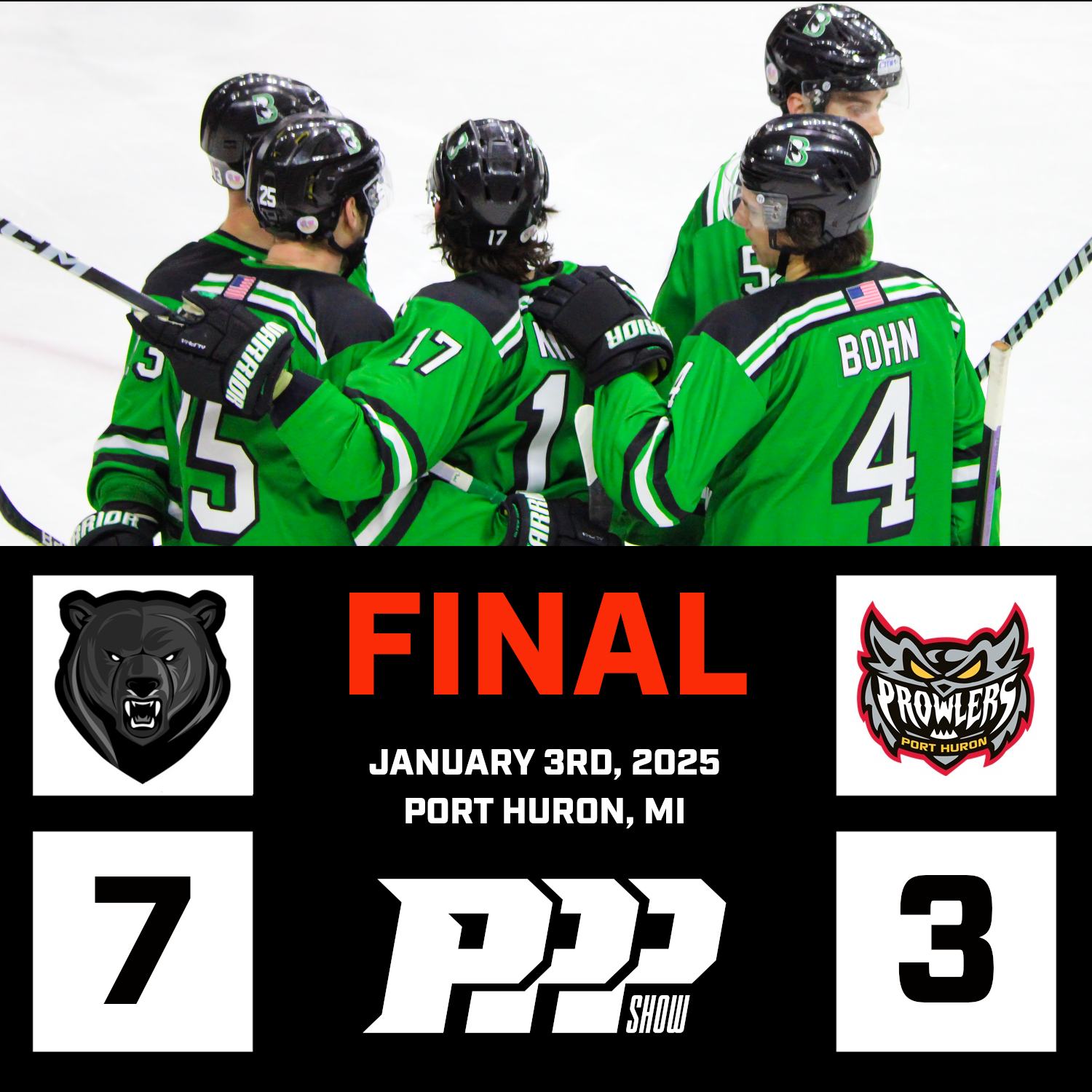 | The Binghamton Black Bears (21-3-1) defeared the Port Huron Prowlers (11-11-3) in Port Huron by the score of 7-3 earning their 21st win and eclipsing 60 points on the season. Continuing his hot scoring streak, Dakota Bohn scored the games first goal on the power play 8:11 into the 1st period why the Prowlers Dan Chartrand was in the box for high-sticking Gavin Yates. Scoring one of his typical garbage style goals in front of the Prowler's net-minder, Tyson Kirkby added to his league lead in goals with his 22nd of the season giving the Black Bears a 2-0 lead. The Prowlers got on the score-sheet after a nice wrist-er by Brett Lockhart that beat Binghamton's goal-tender, Nolan Egbert with 2:30 to go in the period making this a 2-1 game. With Dan Chartrand again in the penalty box this time for a Roughing call and an unsportsmanlike double minor, Chris Mott scored a power play goal at the 11:40 mark. The Black Bears then scored on the second half of the Chartrand double minor penalty with a CJ Stubbs power play goal at the 12:31 mark making this a 4-1 game. Dakota Bohn then scored his 2nd power play goal of the game 14:07 into the second period putting the Black Bears up 5-1 with 4 power play goals. After Scantlebury got a 5 minute major for boarding, Jesse Anderson got an interference penalty putting the teams 4 on 4 but then led to an Austin Thompson goal with 1:10 left to go in the 2nd period giving the Black Bears now 6-1 lead. The Prowlers get one behind Egbert scoring their 2nd goal of the game just 2:40 into the 3rd period off the stick of Reginald Millette. The Prowlers puck luck in the 3rd period continued with another goal, this time from the Prowlers leader Matt Graham at the 6:16 mark making this a 6-3 game. Austin Thompson scored the final goal of the game, a short handed empty net goal with 34 seconds left to go in the game to seal the 7-3 win for the Black Bears. |