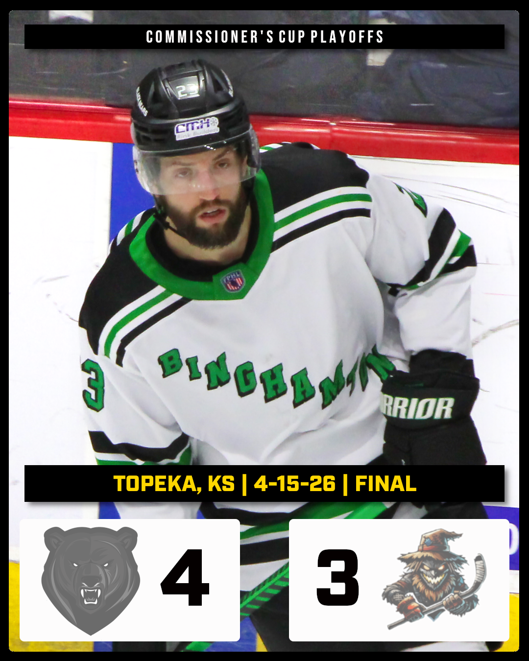 victory. Binghamton outshot Topeka 15-6 in the third period and