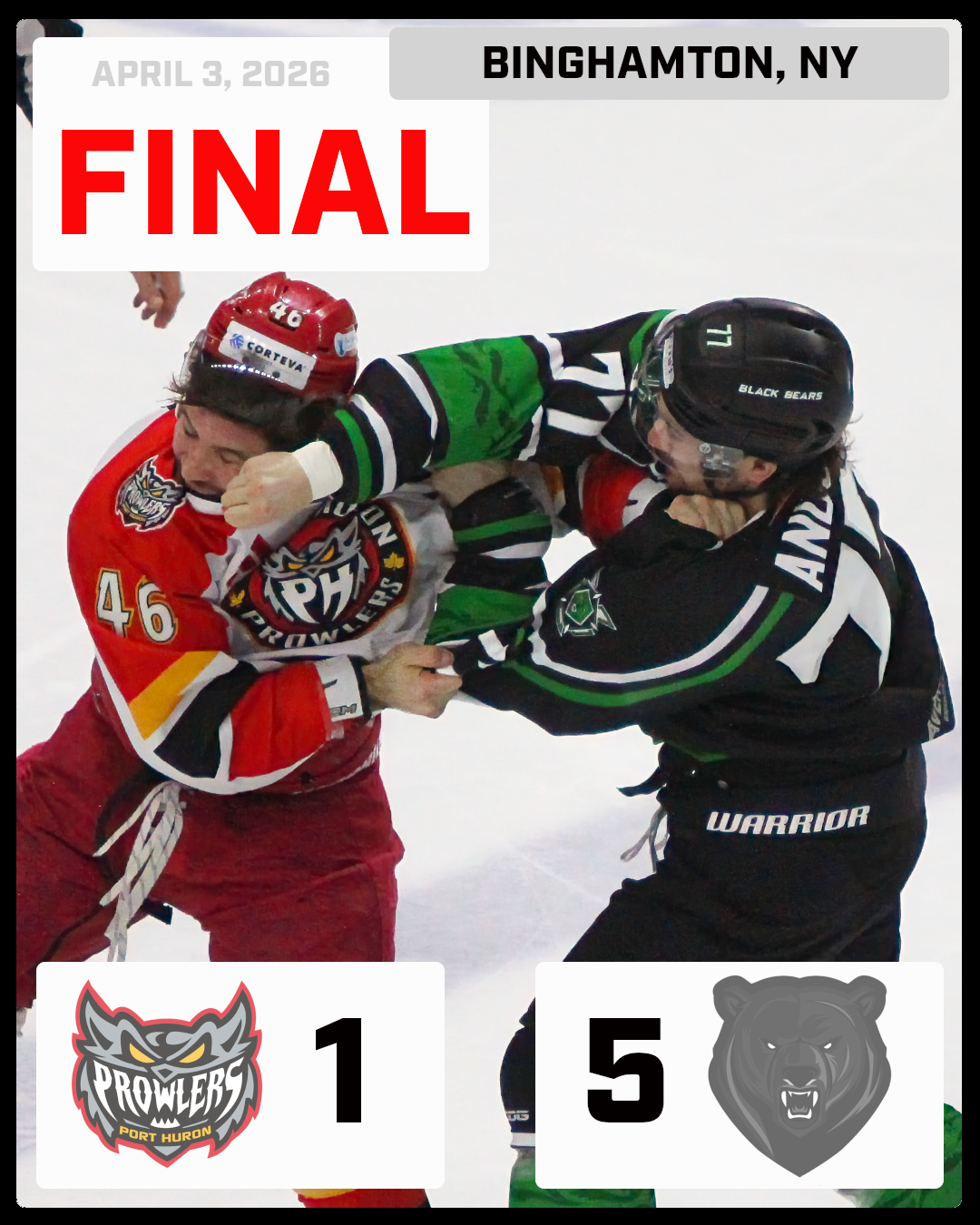 The Binghamton Black Bears (45-6-2) defeated the Port Huron Prowlers