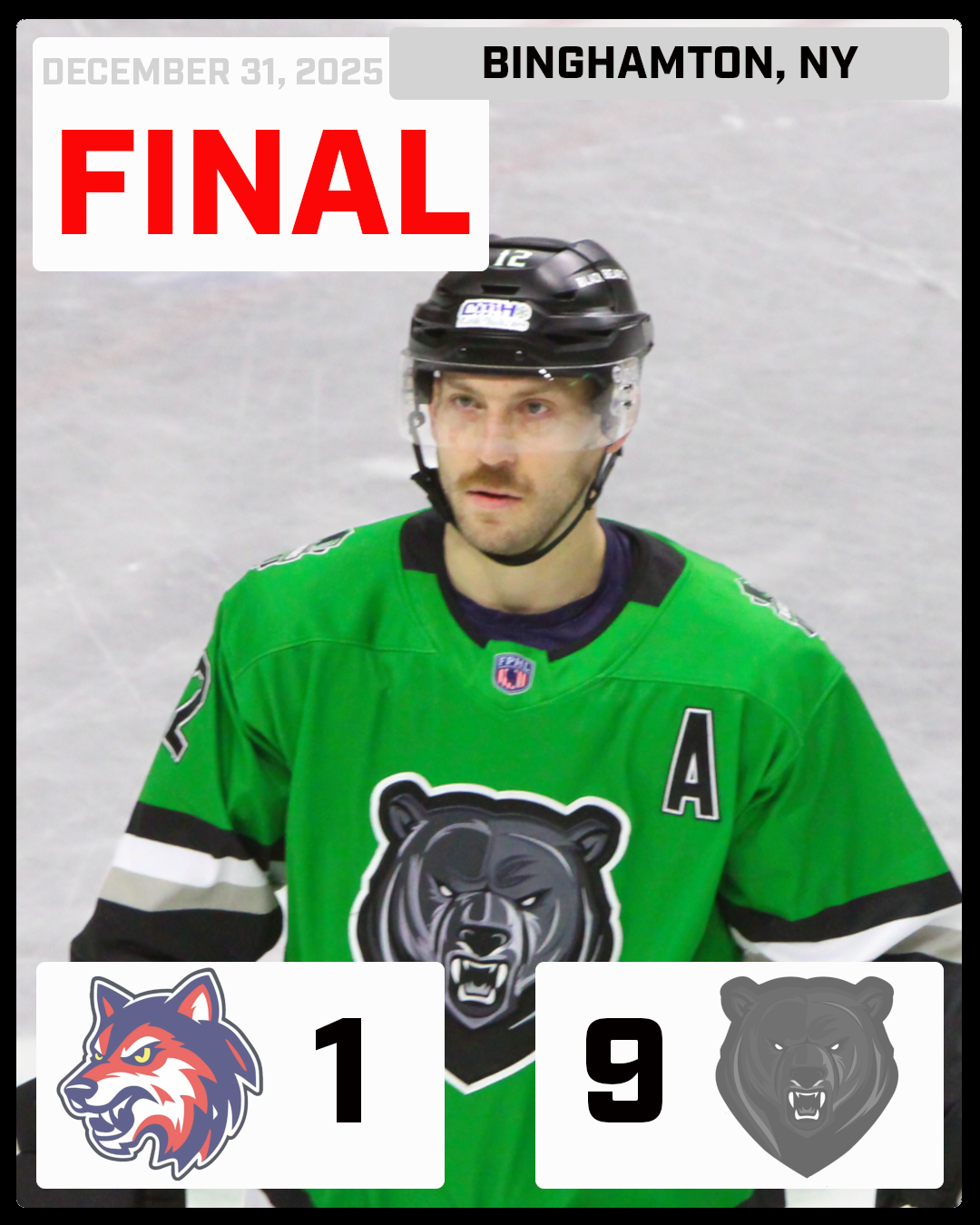 The Binghamton Black Bears (24-2-0) defeated the Watertown Wolves (9-14-2) on New Year's Eve by the score of 9-1 extended their winning streak to 15. Gavin Yates gets the Black Bears on the score-board first with a goal at the 6:05 mark of the 1st period scoring his 15th goal of the season. The Black Bears take a 2-0 lead in the game with 2:58 left in the 1st period off of Gehrett Sargis 4th goal of the season. Nick Swain scores his 8th of the season with 31 second left to go in the period making this a 3-0 lead for the Black Bears. With Ross Zachary and Ryan Gill both in the penalty box for penalty box, the Black Bears score a 5 on 3 power play goal off the stick of Gavin Yates at the 10:14 mark. With Gill still in the box serving his minor for delay of game, Zac Sirota scored the Black Bears 2nd power play goal making this a 5-0 lead for the Black Bears with 9:29 left to go in the middle period. Kyle Stephan made this a 6 goal lead for the Black Bears scoring his 4th goal of the season with just 3:58 left to go in the second period. The former Black Bear, Darion Benchich broke up the shut out bid for Dominik Tmej scoring just 48 seconds into the 3rd period as the Black Bears struggled to get the puck out of the defensive zone. Mac scored his 20th goal of the season with 8:53 left to go in the 3rd period making this a 7-1 game. With just 2:14 left to go, Camron Cervone scored his 2nd goal of the season to give the Black Bears a 7 goal lead. But the Black Bears were not done scoring as Nick Swain scored his 2nd goal of the game with 1 minute to go making this a 9-1 game and the Black Bears 15th straight win ending 2025. |