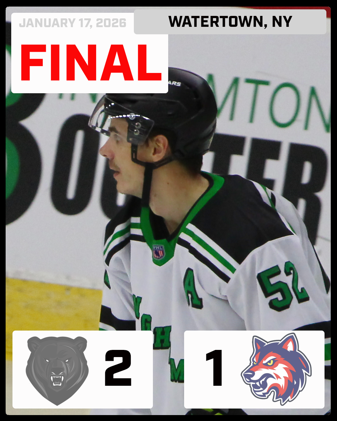 | The Binghamton Black Bears (29-3-0) earned a 2–1 win over the Watertown Wolves (11-16-3) on Saturday night, with all three goals in the game coming on the power play. Binghamton opened the scoring in the first period when CJ Stubbs converted his ninth power-play goal of the season at 8:25. Watertown pulled even early in the second frame as Hunter Hall cashed in with the man-advantage at 7:01. The Black Bears responded late in the period when Dan Stone restored the lead at 17:18, again on the power play. Neither side found the back of the net in the third period, as Binghamton protected the one-goal margin the rest of the way to secure the 2–1 final. The Black Bears finished the night 2-for-7 on the power play, while the Wolves went 1-for-4. |