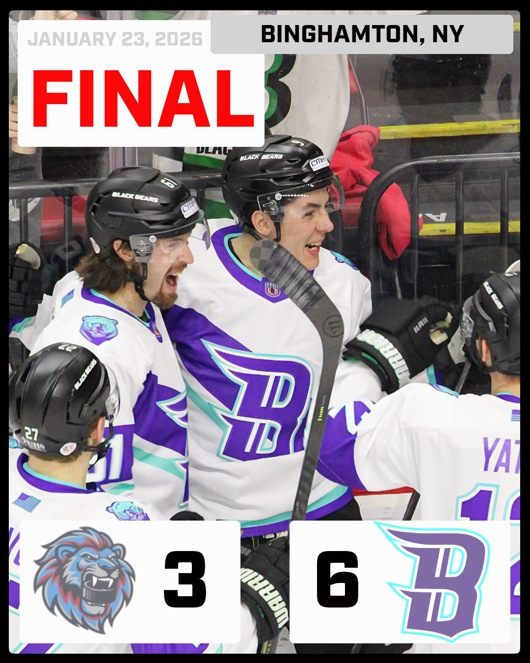 The Binghamton Black Bears (30-3-0) defeated the Pee Dee IceCats (11-17-3) on Friday night, doubling up the IceCats, 6-3. Pee Dee struck first at 3:54 of the opening period as Dominiks Marcinkevics put the IceCats in front 1–0. Binghamton tied the game 11 seconds into the second period when Ivan Bondarenko scored his eighth goal of the season to make it 1–1. Pee Dee regained the lead at 4:23 on a goal from Houston Wilson. The Black Bears pulled even again at 8:48 when Jacob Shankar, returning from injured reserve, converted a feed from Kyle Stephan to make it 2–2. Binghamton took its first lead of the night with 2:14 remaining in the period as Scott Ramaekers scored his seventh of the season. Pee Dee answered before intermission, with Dominiks Marcinkevics recording his second goal of the game to tie the score 3–3 with 55 seconds left in the period. Binghamton went back in front on the power play with 9:57 remaining in the third period as Mac Jansen scored with Timur Rasulov serving a hooking minor. The Black Bears added another power-play goal with 4:53 left when defenseman Dan Stone scored his fifth goal of the season after Matthew Gilbert was penalized for slashing. With Pee Dee goaltender Parker Rutherford pulled for an extra attacker, C.J. Stubbs sealed the game with an empty-net goal in the final 32 seconds to make it 6–3. The win improves Binghamton to 30-3-0 (88 points), while Pee Dee drops to 11-17-3. The teams meet again Saturday night in Binghamton. |