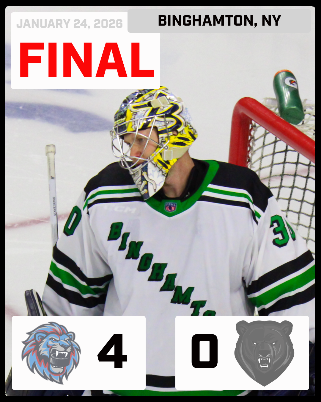 The Binghamton Black Bears (30-4-0) were shutout by the Pee Dee IceCats (12-17-3) on Saturday night by the score of 4-0. After a Black Bears turnover in the offensive zone, the IceCats transitioned quickly the other way and entered the Black Bears’ end. Dominiks Marcinkevics threaded a pass across the slot past defenseman Dan Stone to Alexander Legkov, who converted for the game’s opening goal at 3:50 of the first period. Marcinkevics factored into the scoring again, but this time it was Patriks who found the back of the net. He finished a well-placed feed from Dzaianis Zaichyk, extending the IceCats’ lead at 10:10 of the first period to 2-0. Despite sustained pressure at both ends of the ice, the second period remained scoreless as neither the Black Bears nor the IceCats could capitalize on their opportunities. Dominiks Marcinkevics extended the IceCats’ lead to 3–0 after capitalizing on a Black Bears turnover at 3:44 of the final period. With the Black Bears’ net empty for an extra attacker in the closing minutes, Pee Dee added to the lead as Dzianis Zaichyk scored the fourth and final goal with 1:22 remaining. The IceCats held on to secure the shutout in front of a sold-out crowd in Binghamton on Saturday night. |