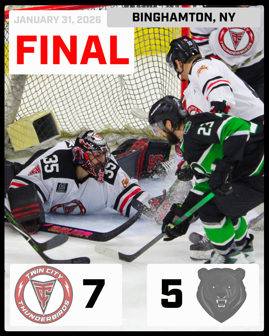 Twin City Thunderbirds (15-17-1) on Saturday by the score of 7-5.