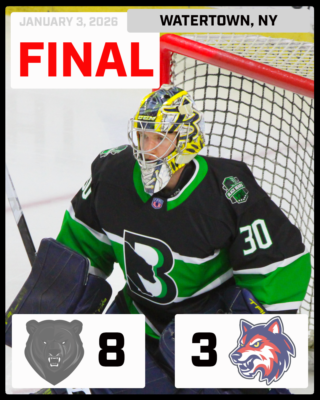 | The Binghamton Black Bears (25-3-0) defeated the Watertown Wolves (10-15-2) in Watertown on Saturday night by the score of 8-3. While CJ Stubbs was in front of the net with his stick planted firmly on the ice, Austin D'Orazio sent the puck over to Stubbs who put it past Wolves net-minder Breandan Colgan for the games first goal at the 4:16 mark of the first period. With Ian McDonald in the penalty box for holding, Austin D'Orazio scored his 13th goal, which is his 10th man-up goal of the season giving the Black Bears a 2-0 lead just 2:16 into the 2nd period. The Black Bears take a 3-0 lead after Gavin Yates scores his 18th of the season, scoring top shelf on Colgan at the 4:50 mark of the 3rd period. On an odd-man rush for the Wolves, they get on the scoreboard with an Egor Filippov goal making this a 3-1 game at the 6:01 mark of the third period. Just 19 seconds later, the Black Bears get their 3 goal lead back with Tyson Kirkby's 8th of the season making this game 4-1. CJ Stubbs scored the Black Bears 5th goal of the game, his 22nd of the season making it a 5-1 game at the 8:49 mark. The Wolves strike back quickly with a Darion Benchich goal just 21 seconds after the Stubbs goal making it a 5-2 game. Zac Sirota scored his 10th goal of the season at the 11:05 mark of the 3rd period, giving the Black Bears a four goal lead again. Just 40 seconds later, Dan Wieber got his second goal of the season giving the Black Bears a 7-2 lead. The Wolves added their 3rd goal of the period off the stick of Hunter Hall with 7:37 left to go in the game. With 35 second left in the period, Gavin Yates added his second goal of the game ending the scoring at 9 goals in the final period but with a Black Bears 8-3 victory. |