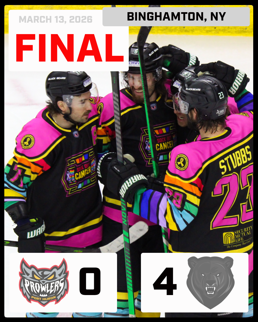 Commissioner’s Cup Playoffs. The opening frame between the Black Bears and the Prowlers was physical from the start, but neither team was able to break through offensively. The teams traded early penalties, with the Prowlers’ Ben Brockway being called for holding just 2:44 into the game. Despite the early power-play opportunity, Binghamton was unable to capitalize as both teams settled into a tight-checking first period. Midway through the period the physical tone continued to escalate, as roughing minors were assessed to Jacob Shankar of Binghamton and Jamie Bucell of Port Huron at 16:12 following a scrum. Things boiled over in the final seconds of the period when Black Bears forward Gehrett Sargis was called for charging at 19:55 after making contact with Prowlers goaltender Reid Cooper. The play immediately sparked a large scrum involving multiple players from both teams, resulting in a flurry of roughing penalties and misconducts being handed out before the teams headed to the locker room. Despite the rising tensions, neither side found the back of the net in the opening twenty minutes. The Black Bears took control of the game in the second period, scoring twice and dominating possession against the Prowlers. After a scoreless but physical first period, Binghamton finally broke through at the 8:46 mark. Scott Ramaekers drove hard to the net and buried his 14th goal of the season, finishing a play set up by Gavin Yates and CJ Stubbs to give the Black Bears a 1–0 lead. Just under two minutes later, Binghamton struck again. Gehrett Sargis found the back of the net for his 13th goal of the season at 10:29, finishing a feed from Mac Jansen to extend the lead to 2–0. The Black Bears controlled the pace throughout the period, keeping Port Huron pinned in their own zone for long stretches. Binghamton’s relentless pressure limited the Prowlers to just three shots on goal in the entire period, while the Black Bears peppered the Port Huron net with fifteen. Tempers also continued to flare. Midway through the period, Ben Brockway was called for boarding after delivering a hit on Dan Stone along the boards. Stone stayed down briefly but was able to get back to his skates and rejoin the play. Late in the frame, another heated moment occurred when Vincent Dekumbis was penalized for hooking Nick Swain, sending Swain sliding into the net and into Prowlers goaltender Reid Cooper. After Swain got up, Cooper took a couple of jabs at the Black Bears forward, leading to another brief confrontation before officials stepped in. By the end of the second period, Binghamton had firmly seized momentum and carried a 2–0 lead into the final frame. Port Huron pushed in the third period but could not solve Tmej. While the Black Bears were shorthanded late in the game after Dan Wieber was called for boarding, Binghamton struck again. At 14:19, CJ Stubbs took a perfect feed from Ivan Bondarenko and buried a shorthanded goal to extend the lead to 3–0 with just over five minutes remaining. The Prowlers later pulled Cooper for the extra attacker, but Mac Jansen sealed the win with an empty-net goal at 18:14. The assist on Stubbs’ goal marked a milestone moment for Ivan Bondarenko, whose 68th assist of the season set a new single-season franchise record, breaking the previous mark held by Kyle Powell during the team’s inaugural 2021–22 season. Between the pipes, Dominik Tmej was sharp all night, stopping all 26 Port Huron shots to earn his fifth shutout of the season. |