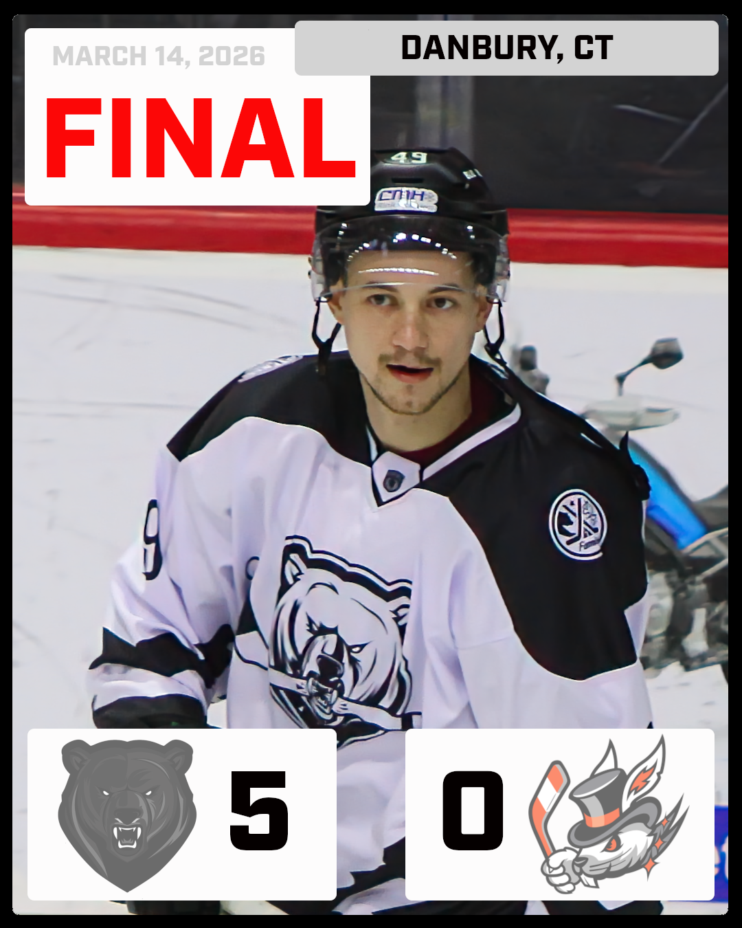 5–0 Saturday evening at the Danbury Ice Arena. Coming off a 4–0