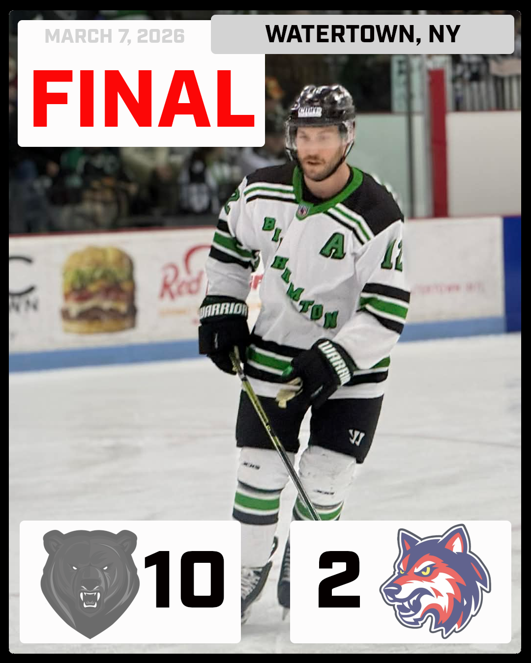 Watertown, NY defeating the Wolves 10-2. The Binghamton Black Bears