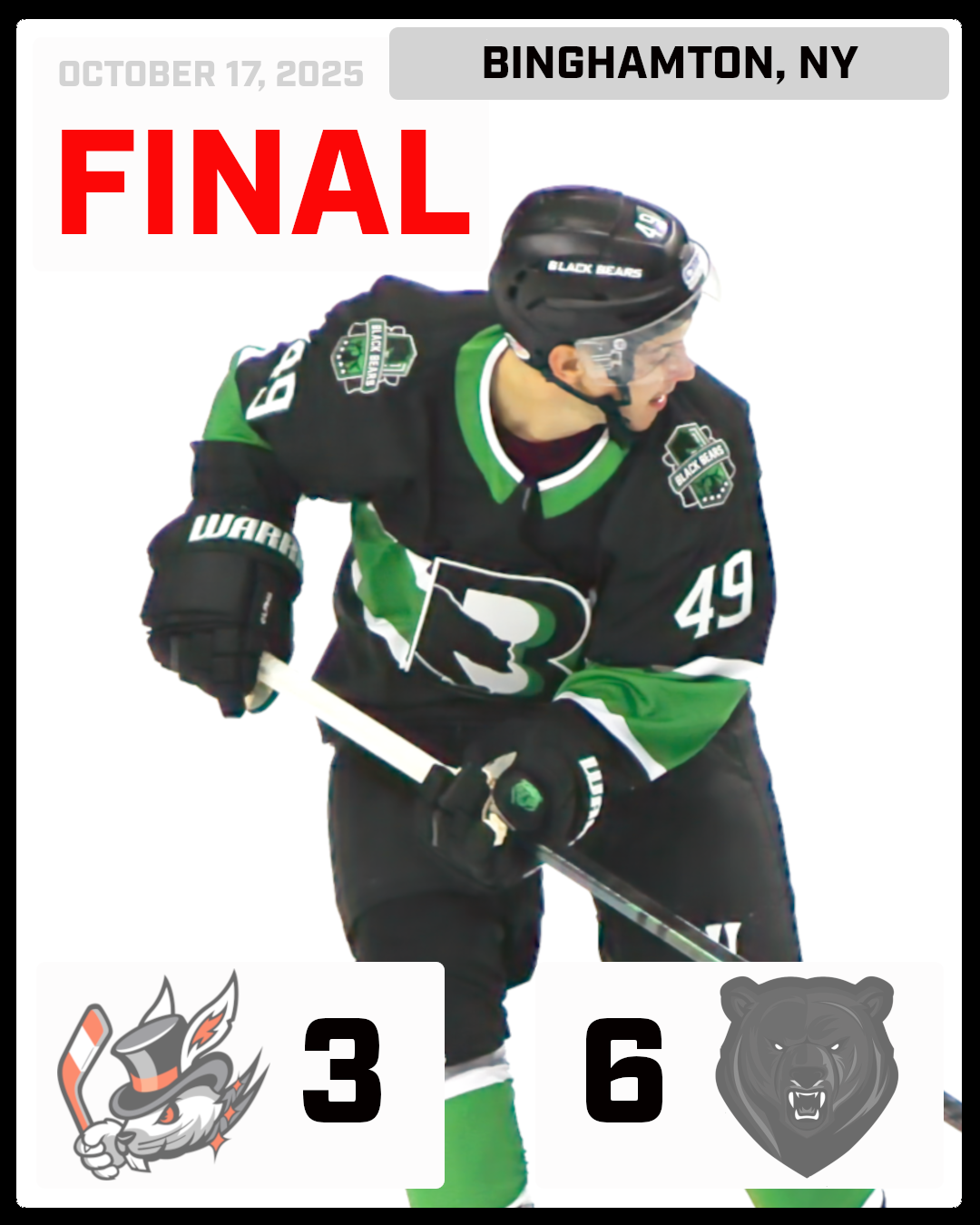 The Binghamton Black Bears (3-0-0) defeated the Danbury Hat Tricks (0-3-0) by the score of 6-3 on Friday night. The Black Bears get on the board first with a Cam Clark goal after tapping in a rebound shot after a Dan Stone shot was mis-handled by the Hat Tricks net-minder just 2:31 into the game. Coming in all alone in the offensive zone and receiving a pass from Jesse Anderson, Ivan Bondarenko scored his first goal of the season giving the Black Bears a 2-0 lead just 4:14 in. The Hat Trick get the game to within 1 goal with a Power Play Goal from Jordon Kromm with 24 seconds left to go in the period as Zac Sirota was tagged with goalie interference making contact with the Hat Tricks Kyle Penton. The Black Bears take a two goal lead again after Ivan Bondarenko scores his 2nd goal of the night after flying through the slot and beating Penton again this time at the 1:57 mark of the 2nd period. With Dan Wieber in the penalty box for tripping the Hat Tricks scored their 2nd power play goal off the stick of their Captain, Jonny Ruiz 5:38 into the middle period. The Black Bears once again go up by 2 goals, this time because of an Austin Thompson power play tally with 2 minutes and 34 seconds left to go in the period. The Hat Tricks again made this a 1 goal game with an Austan Bellefeuille shot hit off one of the Black Bears in front of Connor McAnanama and into the net at the 7:09 mark of the third period. Gavin Yates scored his first goal of the season and it was the insurance goal putting them up 5-3 with just 1 minute and 17 seconds left in the game. Scott Ramaekers made this game a 6-3 score with just 39 seconds to go after a great feed from Jacob Shankar who assisted on three goals in the Black Bears 3rd win of the season. |